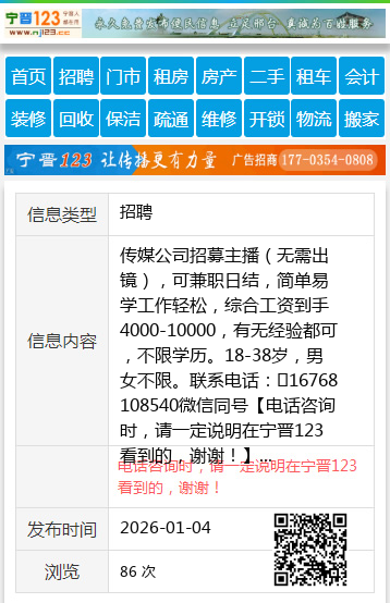 传媒公司招募主播(无需出镜),可兼职日结,简单易学工作轻松,综合工资到手4000-10000,有无经验都可,不限学历。18-38岁,男女不限。联系电话:16768108540微信同号 【电话咨询时,请一定说明在宁晋123看到的,谢谢!】 |