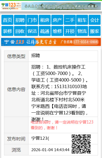 招聘: 1、数控机床操作工(工资5000-7000)。 2、学徒工(工资4000-5000)。