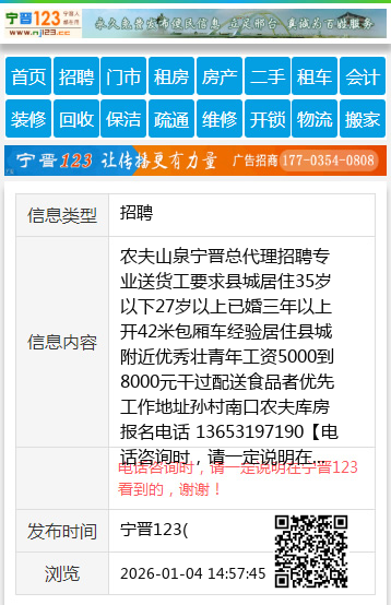 农夫山泉宁晋总代理招聘专业送货工要求县城居住35岁以下27岁以上已婚三年以上开42米包厢车经验居住县城附近优秀壮青年工资5000到8000元干过配送食品者优先工作地址孙村南口农夫库房报名电话 13653197190 【电话咨询时,请一定说明在宁晋123看到的,谢谢!】 |