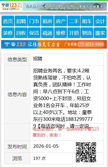 招聘业务两名,要求:4.2厢货熟练驾驶,不怕吃苦,认真负责,团队精神!工作时间:早八点到下午6点,工资5000+上不封顶,另招女业务1名会开车,年龄25岁以上40岁以下。地址:童泰东行300米电话18832997779 【电话咨询时,请一定说明在宁晋123看到的,谢谢!】 |