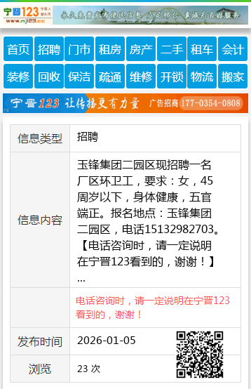玉锋集团二园区现招聘一名厂区环卫工,要求:女,45周岁以下,身体健康,五官端正。报名地点:玉锋集团二园区,电话15132982703。 【电话咨询时,请一定说明在宁晋123看到的,谢谢!】 |