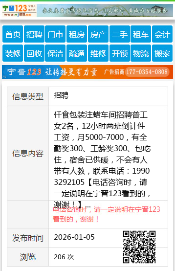 仟食包装注蜡车间招聘普工女2名,12小时两班倒计件工资,月5000-7000,有全勤奖300、工龄奖300、包吃住,宿舍已供暖,不会有人带有人教,联系电话:19903292105 【电话咨询时,请一定说明在宁晋123看到的,谢谢!】 |