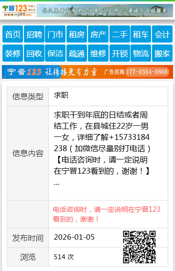 求职干到年底的日结或者周结工作,在县城住22岁一男一女,详细了解+15733184238(加微信尽量别打电话)