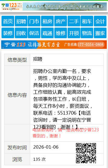 具备良好的沟通协调能力,工作细致认真,能高效完成各项事务性工作,长白班,每天工作8小时,薪资面议,联系电话:5513706 【电话咨询时,请一定说明在宁晋123看到的,谢谢!】 |