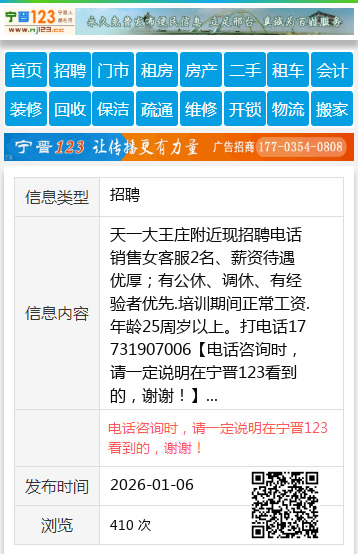 天一大王庄附近现招聘电话销售女客服2名、薪资待遇优厚;有公休、调休、有经验者优先.培训期间正常工资.年龄25周岁以上。打电话17731907006 【电话咨询时,请一定说明在宁晋123看到的,谢谢!】 |