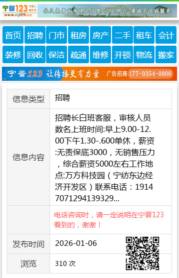 工作地点:万方科技园(宁纺东边经济开发区)联系电话:19147071294