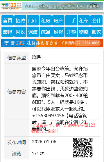 国家今年出台政策。允许纪念币自由买卖,马钞纪念币找兼职。帮我预约就行,不需要你出钱,我这边垫资兜底。预约到就有200~400的💰。5人一组就是1K多,可以找朋友家人一起预约。+15530997456 【电话咨询时,请一定说明在宁晋123看到的,谢谢!】 |