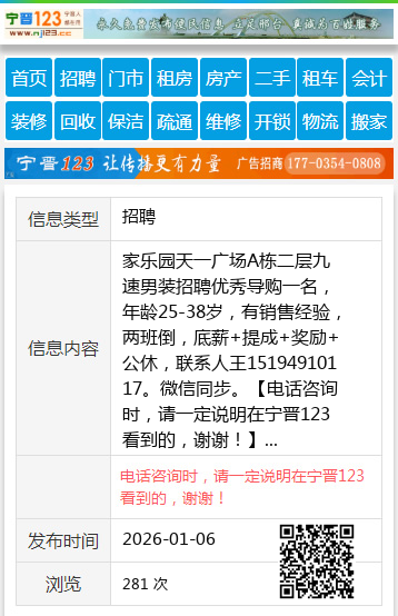 家乐园天一广场A栋二层九速男装招聘优秀导购一名,年龄25-38岁,有销售经验,两班倒,底薪+提成+奖励+公休,联系人王15194910117。微信同步。 【电话咨询时,请一定说明在宁晋123看到的,谢谢!】 |