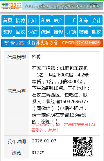石家庄招聘:c1面包车司机,1名,月薪6000起,4.2米箱货,1名,月薪8000起,下午2点到10点。工作地址:石家庄桥西区。包吃住。联系人:裴经理15032696377(同微信) 【电话咨询时,请一定说明在宁晋123看到的,谢谢!】 |