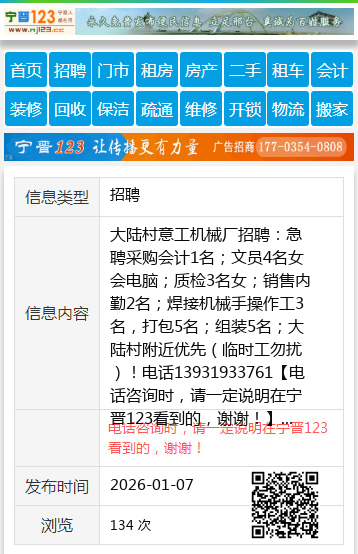 大陆村意工机械厂招聘:急聘采购会计1名;文员4名女会电脑;质检3名女;销售内勤2名;焊接机械手操作工3名,打包5名;组装5名;大陆村附近优先(临时工勿扰)!电话13931933761 【电话咨询时,请一定说明在宁晋123看到的,谢谢!】 |