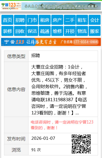 大曹庄企业招聘:1会计,大曹庄周围,有多年经验者优先,45以下,男女不限,会用财务软件。2销售内勤,思维敏捷,善于沟通。有意请电联18131988387 【电话咨询时,请一定说明在宁晋123看到的,谢谢!】 |