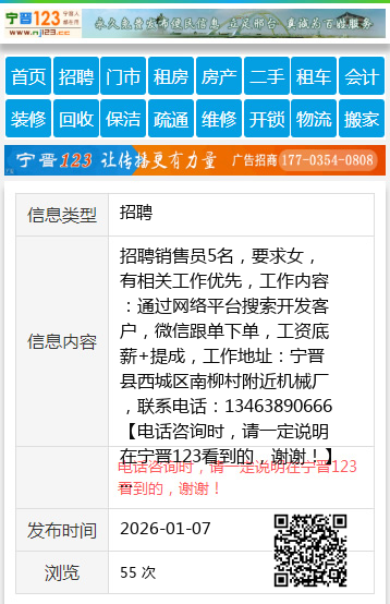 招聘销售员5名,要求女,有相关工作优先,工作内容:通过网络平台搜索开发客户,微信跟单下单,工资底薪+提成,工作地址:宁晋县西城区南柳村附近机械厂,联系电话:13463890666 【电话咨询时,请一定说明在宁晋123看到的,谢谢!】 |