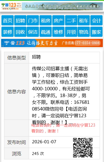 传媒公司招募主播(无需出镜),可兼职日结,简单易学工作轻松,综合工资到手4000-10000,有无经验都可,不限学历。18-38岁,男女不限。联系电话:16768108540微信同号 【电话咨询时,请一定说明在宁晋123看到的,谢谢!】 |