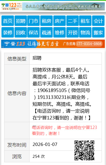 招聘双休客服,最后4个人。高提成,月公休8天。最后最后半天面试哈,联系电话:19061895105(微信同号)19131330231长期业务,短期勿扰。高提成。高提成。 【电话咨询时,请一定说明在宁晋123看到的,谢谢!】 |