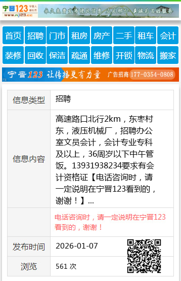 高速路口北行2km,东枣村东,液压机械厂,招聘办公室文员会计,会计专业专科及以上,36周岁以下中午管饭。13931938234要求有会计资格证 【电话咨询时,请一定说明在宁晋123看到的,谢谢!】 |