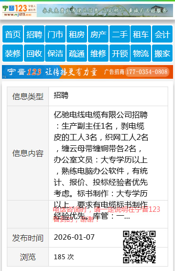 亿驰电线电缆有限公司招聘:生产副主任1名,剥电缆皮的工人3名,织网工人2名,缠云母带缠铜带各2名,办公室文员:大专学历以上,熟练电脑办公软件,有统计、报价、投标经验者优先考虑。