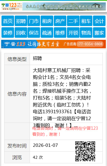 | 防骗提醒: | 宁晋123(www.nj123.cc)提醒您:手工活、网络兼职、刷单,都是骗子!凡以各种名义收取费用的都是骗子!找工作是往兜里挣钱,让你往外掏钱的都是骗子!异地招聘请提高警惕,谨防诈骗! |