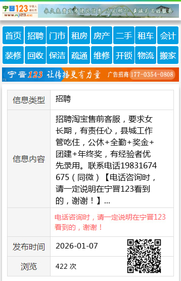 招聘淘宝售前客服,要求女长期,有责任心,县城工作管吃住,公休+全勤+奖金+团建+年终奖,有经验者优先录用。联系电话19831674675(同微) 【电话咨询时,请一定说明在宁晋123看到的,谢谢!】 |