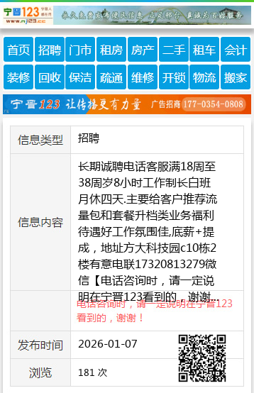 长期诚聘电话客服满18周至38周岁8小时工作制长白班月休四天.主要给客户推荐流量包和套餐升档类业务福利待遇好工作氛围佳,底薪+提成,地址方大科技园c10栋2楼有意电联17320813279微信 【电话咨询时,请一定说明在宁晋123看到的,谢谢!】 |