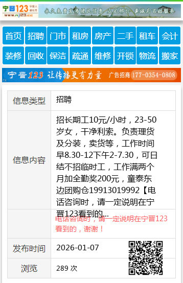 招长期工10元/小时,23-50岁女,干净利索。负责理货及分装,卖货等,工作时间早8.30-12下午2-7.30,可日结不招临时工,工作满两个月加全勤奖200元,童泰东边团购仓19913019992 【电话咨询时,请一定说明在宁晋123看到的,谢谢!】 |