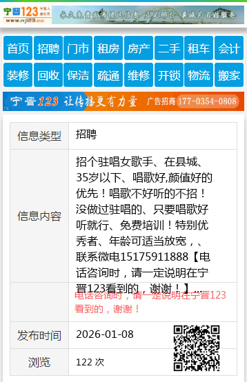 招个驻唱女歌手、在县城、35岁以下、唱歌好,颜值好的优先!唱歌不好听的不招!没做过驻唱的、只要唱歌好听就行、免费培训!特别优秀者、年龄可适当放宽,、联系微电15175911888