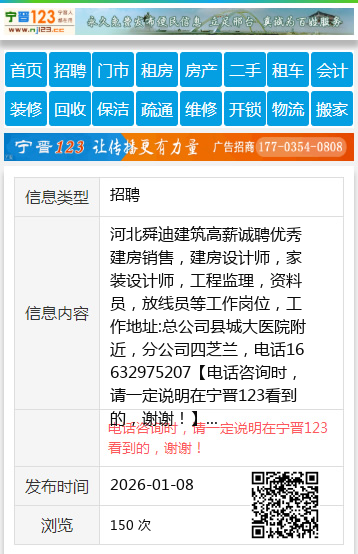 | 防骗提醒: | 宁晋123(www.nj123.cc)提醒您:手工活、网络兼职、刷单,都是骗子!凡以各种名义收取费用的都是骗子!找工作是往兜里挣钱,让你往外掏钱的都是骗子!异地招聘请提高警惕,谨防诈骗! |