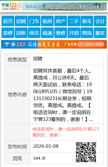 | 防骗提醒: | 宁晋123(www.nj123.cc)提醒您:手工活、网络兼职、刷单,都是骗子!凡以各种名义收取费用的都是骗子!找工作是往兜里挣钱,让你往外掏钱的都是骗子!异地招聘请提高警惕,谨防诈骗! |