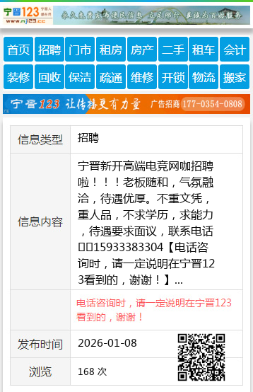 宁晋新开高端电竞网咖招聘啦!!!老板随和,气氛融洽,待遇优厚。不重文凭,重人品,不求学历,求能力,待遇要求面议,联系电话☎️15933383304 【电话咨询时,请一定说明在宁晋123看到的,谢谢!】 |