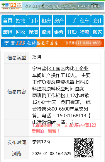 宁晋盐化工园区内化工企业车间扩产操作工10人。 主要工作负责反应釜机器上料加料控制原料反应时间温度;两班倒工作轻松上12小时歇12小时七天一倒白夜班。 综合待遇5800-6500产量奖另算。电话: 15031168113 【电话咨询时,请一定说明在宁晋123看到的,谢谢!】 |
