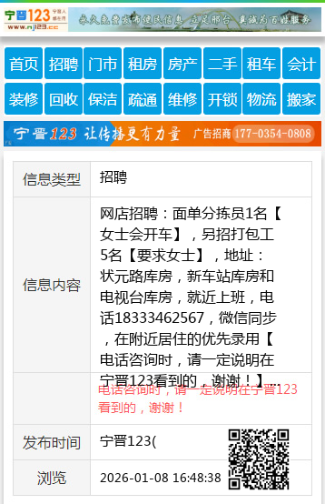 网店招聘:面单分拣员1名【女士会开车】,另招打包工5名【要求女士】,地址:状元路库房,新车站库房和电视台库房,就近上班,电话18333462567,微信同步,在附近居住的优先录用 【电话咨询时,请一定说明在宁晋123看到的,谢谢!】 |