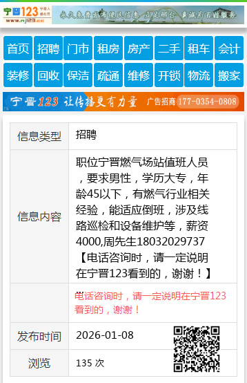 职位宁晋燃气场站值班人员,要求男性,学历大专,年龄45以下,有燃气行业相关经验,能适应倒班,涉及线路巡检和设备维护等,薪资4000,周先生18032029737 【电话咨询时,请一定说明在宁晋123看到的,谢谢!】 |