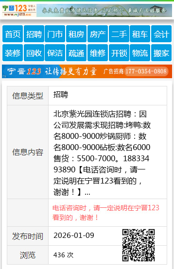 北京紫光园连锁店招聘:因公司发展需求现招聘:烤鸭:数名8000-9000炒锅厨师:数名8000-9000砧板:数名6000售货:5500-7000。18833493890 【电话咨询时,请一定说明在宁晋123看到的,谢谢!】 |