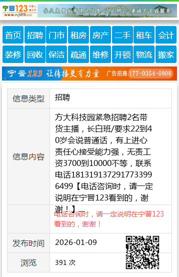 方大科技园紧急招聘2名带货主播,长白班/要求22到40岁会说普通话,有上进心责任心接受能力强,无责工资3700到10000不等,联系电话1813191372917733996499 【电话咨询时,请一定说明在宁晋123看到的,谢谢!】 |