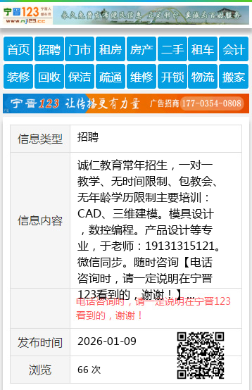 诚仁教育常年招生,一对一教学、无时间限制、包教会、无年龄学历限制主要培训:CAD、三维建模。模具设计,数控编程。产品设计等专业,于老师:19131315121。微信同步。随时咨询 【电话咨询时,请一定说明在宁晋123看到的,谢谢!】 |