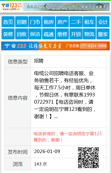 电缆公司招聘电话客服、业务销售若干,有经验优先,每天工作7.5小时,周日单休,节假日休,有意联系19930722971