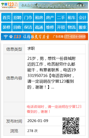 21岁,男,想找一份县城附近的工作,吃苦耐劳什么都能干,有意者联系,电话19331950716