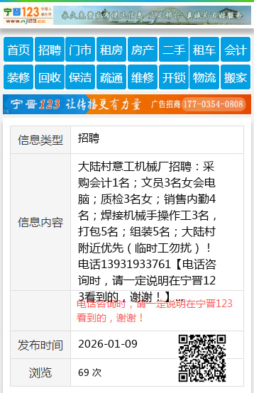 | 防骗提醒: | 宁晋123(www.nj123.cc)提醒您:手工活、网络兼职、刷单,都是骗子!凡以各种名义收取费用的都是骗子!找工作是往兜里挣钱,让你往外掏钱的都是骗子!异地招聘请提高警惕,谨防诈骗! |