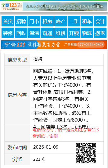 网店诚聘:1、运营助理3名。大专及以上学历专业跟电商有关的优先工资4000+。有晋升体制.节假日福利等。2、网店打字客服3名,有相关工作经验。工资4000+。3、主播数名和助播,必须有工作经验,固定工资8000+。4、网店美工3名。联系电话 13303194319 宁高路电视台西行 【电话咨询时,请一定说明在宁晋123看到的,谢谢!】 |