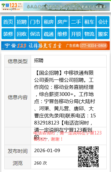 【国企招聘】中移铁通有限公司委托一橙公司招聘。工作岗位:移动业务直销经理,综合薪资3000+。工作地点:宁晋各移动分局(大陆村、河渠、黄儿营、唐邱、大曹庄优先录用)联系电话:15832918123 【电话咨询时,请一定说明在宁晋123看到的,谢谢!】 |