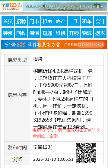 招跑近途4.2米高栏司机一名,送轻货在方大科技园工厂,工资5000元管吃住,上班时间8—7点,超过了计加班,要求开过4.2米高栏车的司机,因工作忙,一定勿扰。(不作过多解释,谢谢13903192653 【电话咨询时,请一定说明在宁晋123看到的,谢谢!】 |