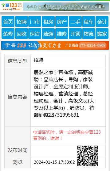 居然之家宁晋商场,高薪诚聘:品牌店长,导购,家装设计师,全屋定制设计师。楼层经理,营销经理,总经理助理,会计,高级文员(大专及以上学历),消防员。待遇面议18731995691