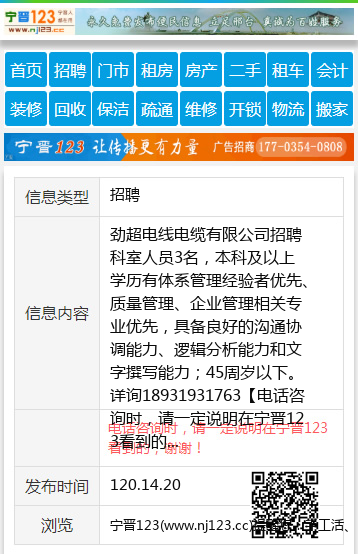 劲超电线电缆有限公司招聘科室人员3名,本科及以上学历有体系管理经验者优先、质量管理、企业管理相关专业优先,具备良好的沟通协调能力、逻辑分析能力和文字撰写能力;45周岁以下。详询18931931763 【电话咨询时,请一定说明在宁晋123看到的,谢谢!】 |