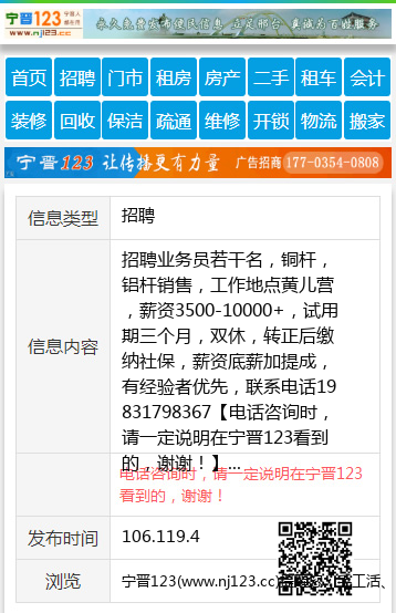 招聘业务员若干名,铜杆,铝杆销售,工作地点黄儿营,薪资3500-10000+,试用期三个月,双休,转正后缴纳社保,薪资底薪加提成,有经验者优先,联系电话19831798367 【电话咨询时,请一定说明在宁晋123看到的,谢谢!】 |