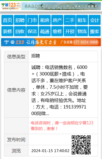 诚聘:电话销售数名,6000+(3000底薪+提成),电话不多,重在维护客户关系,单休,7.5小时不加班,要求:女25岁以上,会说普通话,有电销经验优先。地址:方大,电话:19133997100同微 【电话咨询时,请一定说明在宁晋123看到的,谢谢!】 |