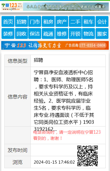 宁晋县净安血液透析中心招聘:1、医师、助理医师5名,要求专科学历及以上,持相关从业资格证书,有临床经验。2、医学院应届毕业生5名,要求专科学历,临床专业.待遇面谈(不低于其它同类岗位工资水平)19033192162 【电话咨询时,请一定说明在宁晋123看到的,谢谢!】 |