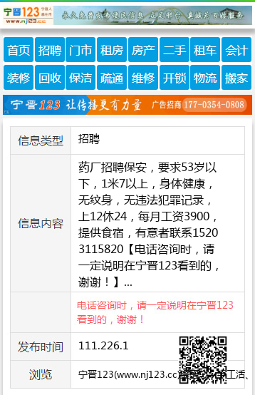 药厂招聘保安,要求53岁以下,1米7以上,身体健康,无纹身,无违法犯罪记录,上12休24,每月工资3900,提供食宿,有意者联系15203115820 【电话咨询时,请一定说明在宁晋123看到的,谢谢!】 |