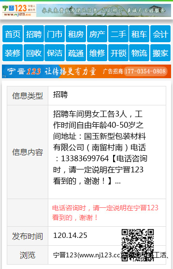 招聘车间男女工各3人,工作时间自由年龄40-50岁之间地址:国玉新型包装材料有限公司(南留村南)电话:13383699764 【电话咨询时,请一定说明在宁晋123看到的,谢谢!】 |