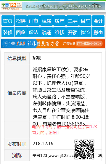 诚招康复护工(女),要求:有耐心,责任心强,年龄50岁以下,护理老人(女)康复,辅助日常生活及康复锻炼,病人无管路,不需要喂饭,左侧肢体偏瘫,头脑清楚,老人目前在宁晋安康医院住院康复,工作时间:8:00-18:00,有意者电联15613953166 【电话咨询时,请一定说明在宁晋123看到的,谢谢!】 |