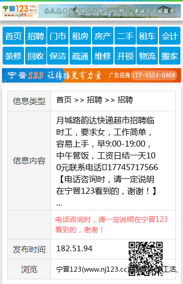 月城路韵达快递超市招聘临时工,要求女,工作简单,容易上手,早9:00-19:00,中午管饭,工资日结一天100元联系电话17745717566