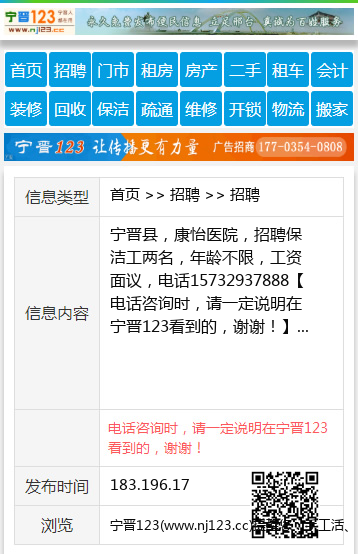 宁晋县,康怡医院,招聘保洁工两名,年龄不限,工资面议,电话15732937888